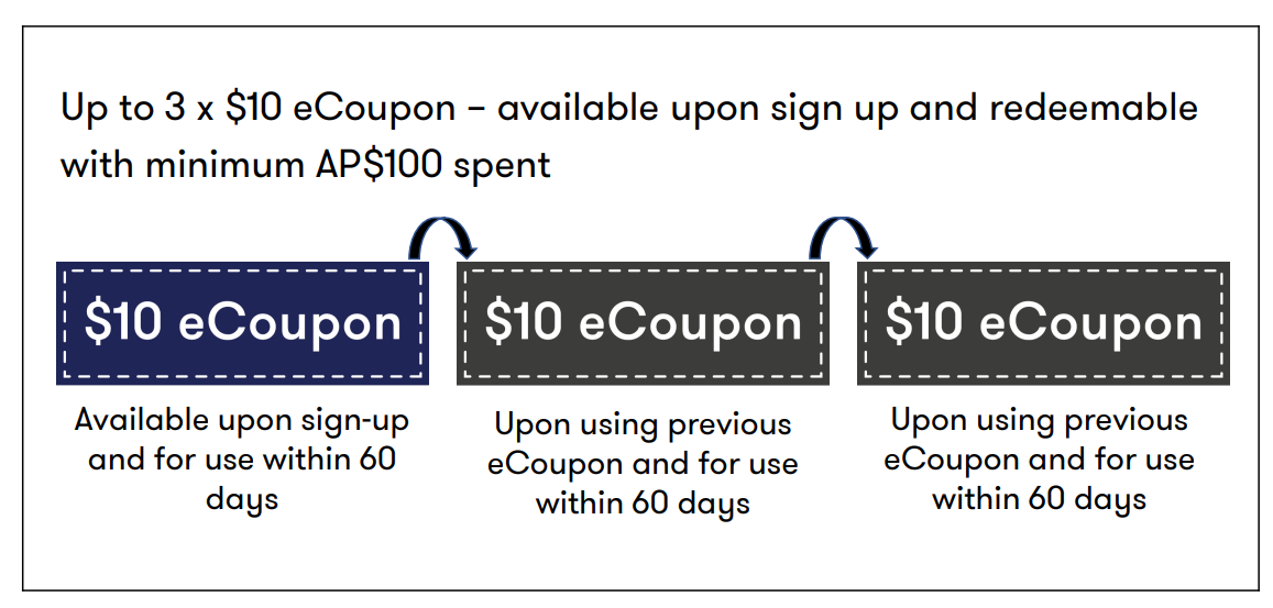 - Get up to 3x $10 eCoupon each with minimum AP$100 spent